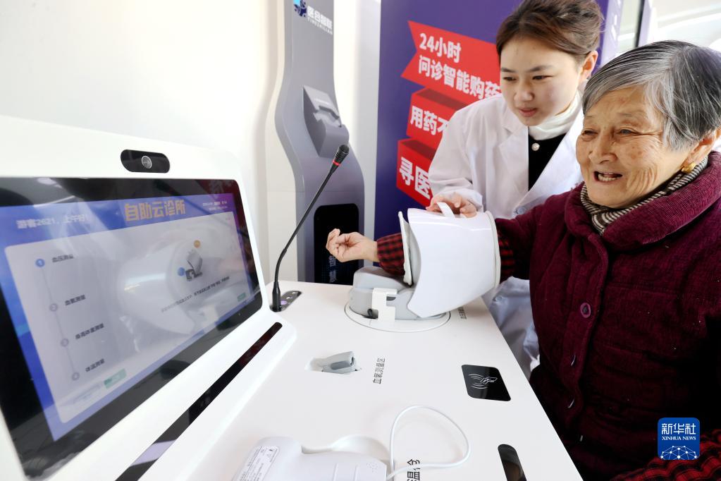 在浙江省湖州市德清县阜溪街道兴山未来社区居家养老服务中心,家庭医生辅助社区老人进行云问诊(2023年2月16日摄)。新华社发(谢尚国摄)
