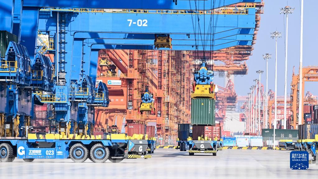 在广西钦州港自动化集装箱码头,无人驾驶车辆在转运集装箱(2023年2月25日摄)。新华社记者张爱林摄