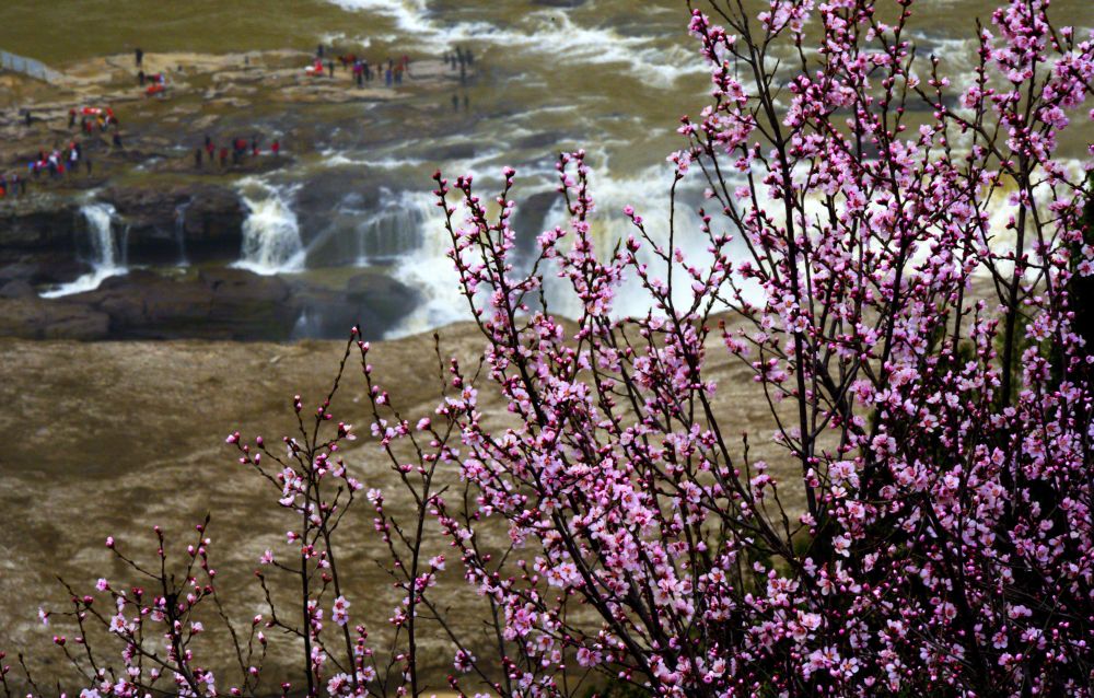 连日来,随着气温回暖,受上游融冰开河影响,位于山西吉县和陕西宜川县交界的黄河壶口瀑布迎来一年一度的“桃花汛”,瀑布水量骤然加大,形成数百米壮美瀑布群,两岸山花盛放,春花飞瀑交相辉映共同构成了一幅壮美的春日江山图。