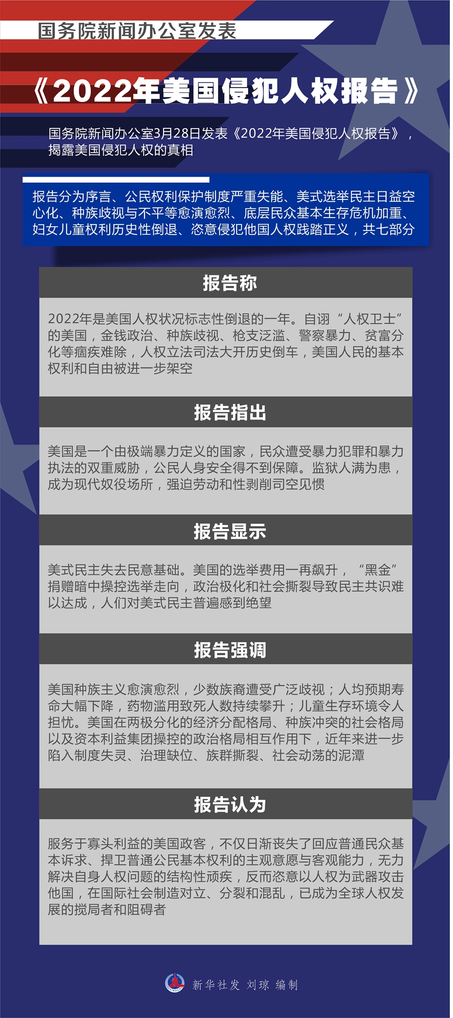 新华社北京3月28日电 国务院新闻办公室28日发表《2022年美国侵犯人权报告》,揭露美国侵犯人权的真相。
