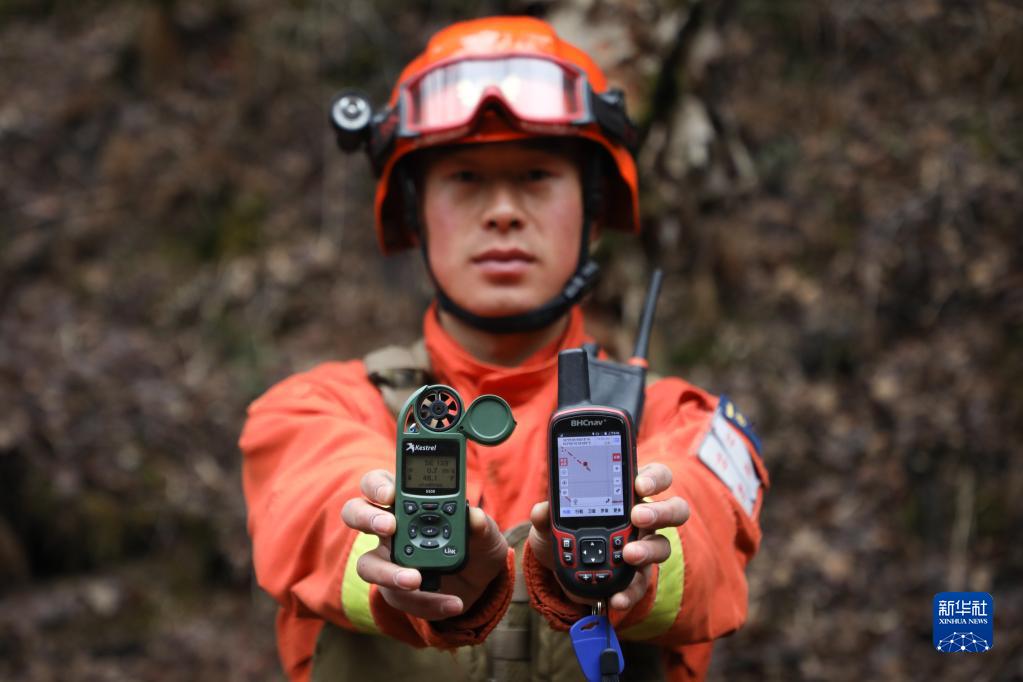4月4日,连城驻防分队指战员展示在巡护中使用的卫星定位仪、测风仪。新华社记者马希平摄