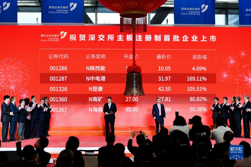 这是4月10日在深圳证券交易所拍摄的沪深交易所主板注册制首批企业上市仪式现场。新华社记者毛思倩摄