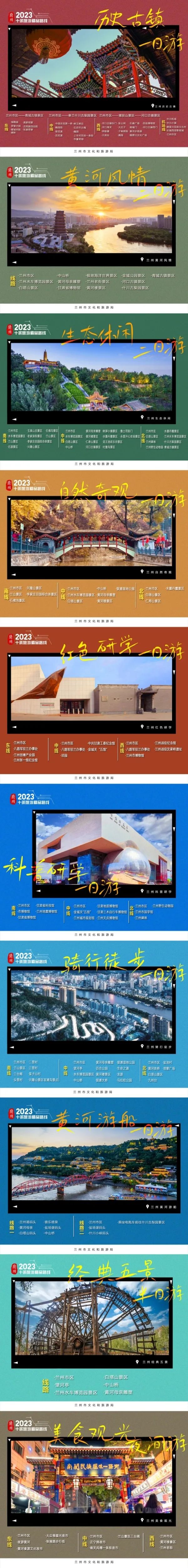 4月10日,兰州市文旅局全新发布10条旅游精品线路和“美好四季”近百项文旅活动,全力激活兰州文旅市场。本次发布的10条线路以黄河为轴线,分“南、中、北”“东、中、西”线布局展开,还特别设计了骑行徒步线,满足骑行徒步旅游爱好者的需求。