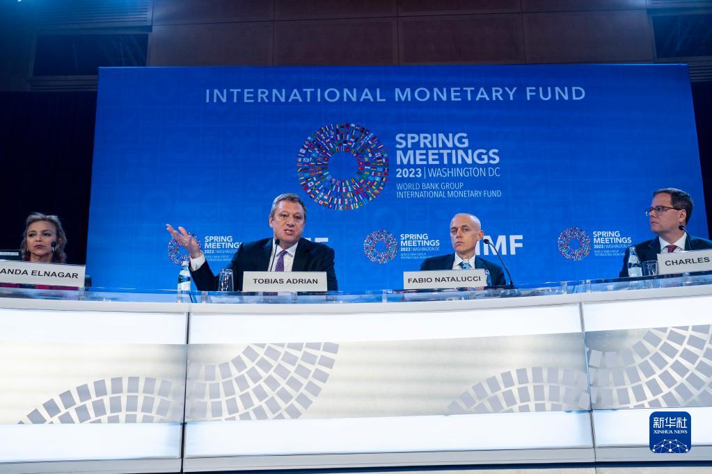 4月11日,在美国华盛顿,IMF货币与资本市场部主任托比亚斯·阿德里安(左二)出席记者会。新华社记者刘杰摄