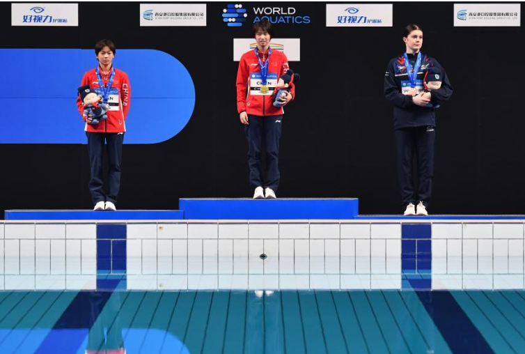 4月16日,冠军中国选手陈芋汐(中)、亚军中国选手全红婵(左)与季军英国选手西里埃在颁奖仪式上。新华社记者张博文摄