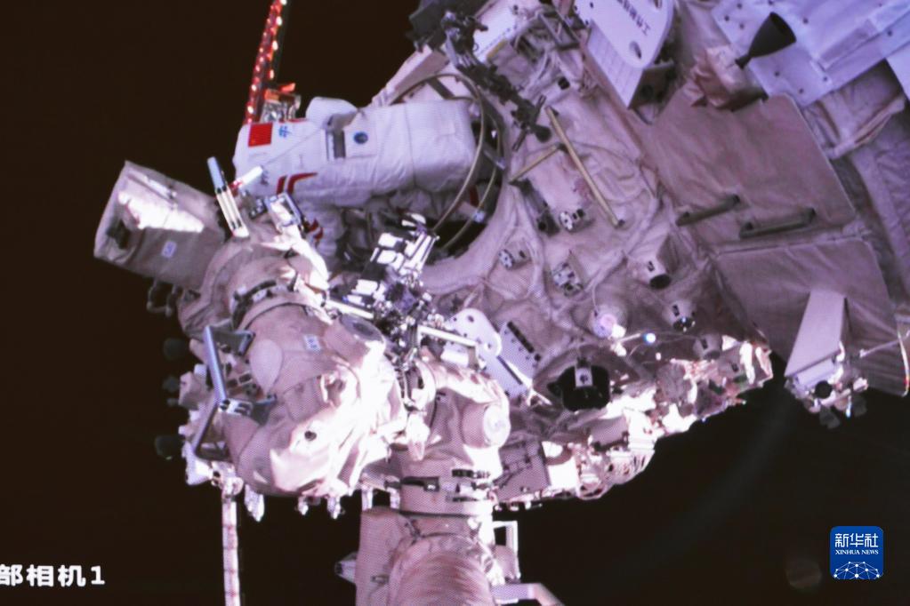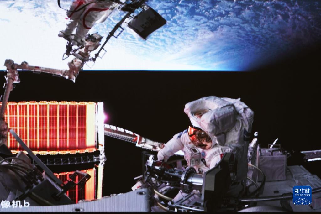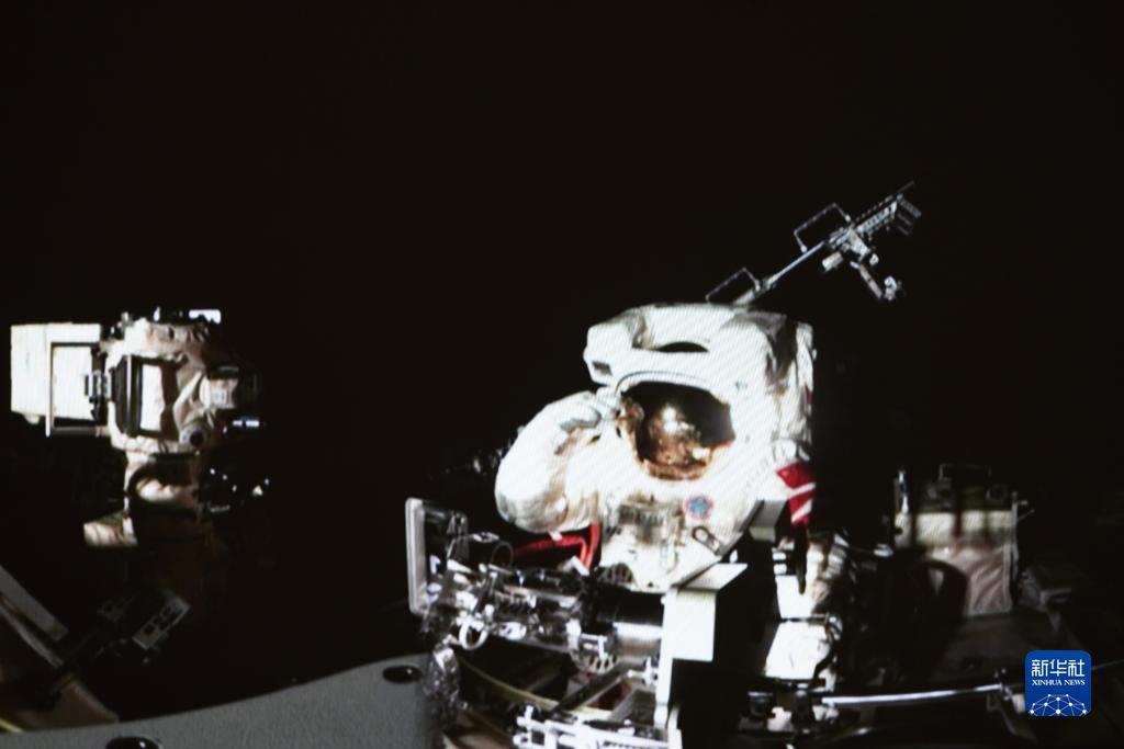 4月15日在北京航天飞行控制中心拍摄的神舟十五号航天员张陆开展舱外操作的画面。新华社记者 郭中正 摄
