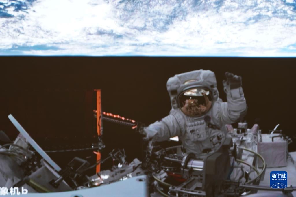 4月15日在北京航天飞行控制中心拍摄的神舟十五号航天员张陆结束出舱任务返回问天实验舱时挥手致意的画面。新华社记者 郭中正 摄