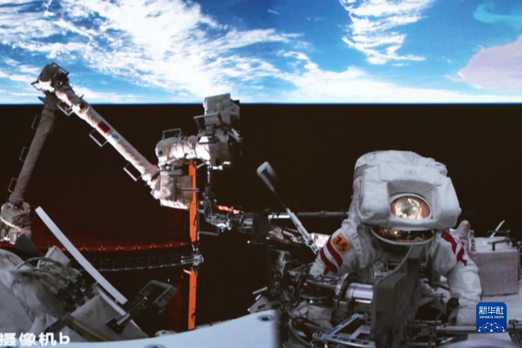 4月15日在北京航天飞行控制中心拍摄的神舟十五号航天员费俊龙开展舱外操作的画面。新华社记者 郭中正 摄