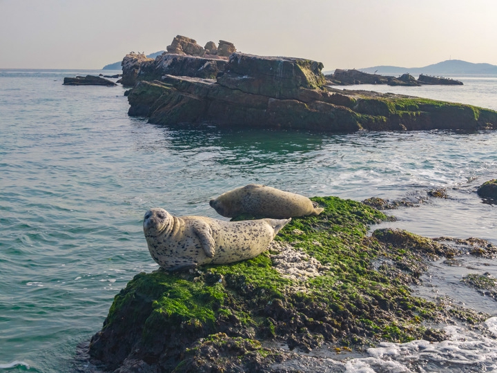 2023年4月2日,在山东烟台长岛海域,斑海豹在礁石上休憩(无人机照片)。新华社发(张维康摄)