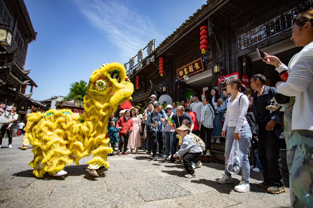 4月30日,游客在重庆市秀山土家族苗族自治县洪安镇老街观看舞狮表演。(胡程摄)