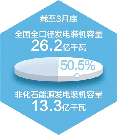 中国电力企业联合会近日发布的报告显示:截至3月底,全国全口径发电装机容量26.2亿千瓦,其中非化石能源发电装机容量13.3亿千瓦,同比增长15.9%,占总装机容量比重为50.5%,首次超过50%。具体看,水电4.2亿千瓦,核电5676万千瓦,并网风电3.76亿千瓦,并网太阳能发电4.3亿千瓦,形成了多元化清洁能源供应体系。