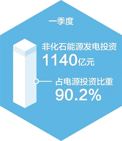 非化石能源发电投资较快增长。一季度,全国主要发电企业电源工程完成投资1264亿元,同比增长55.2%,其中非化石能源发电投资1140亿元,同比增长62.8%,占电源投资的比重达到90.2%。具体看,太阳能发电、核电、风电投资同比分别增长177.6%、53.5%、15%。