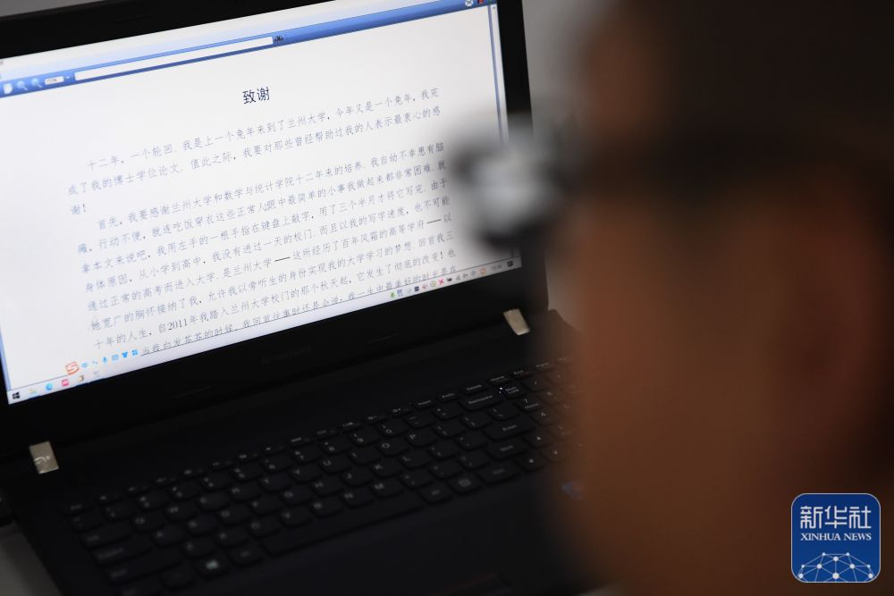 谢炎廷在兰州大学理工楼的自习室里修改自己的“毕业论文”致谢部分(5月10日摄)。