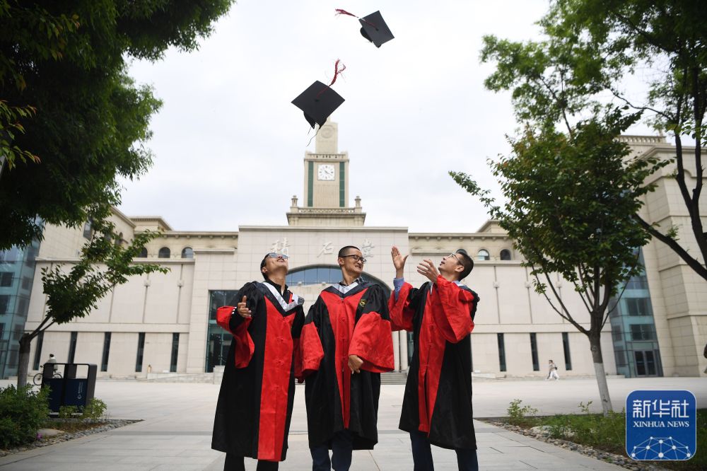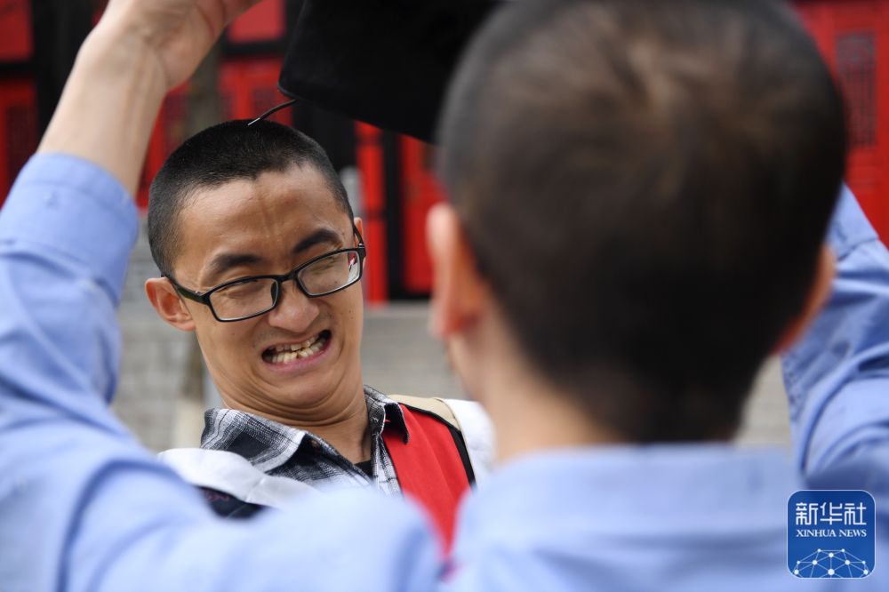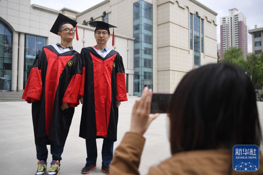 在兰州大学,谢炎廷(右二)和同学们排练“毕业”合影姿势(5月12日摄)。