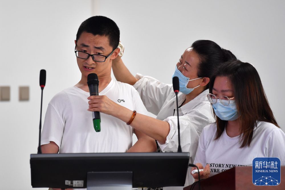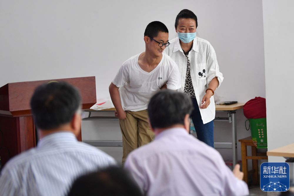 5月24日,谢炎廷(左)在兰州大学数学与统计学院进行论文答辩,母亲刘小凤(中)在一旁为他擦汗。