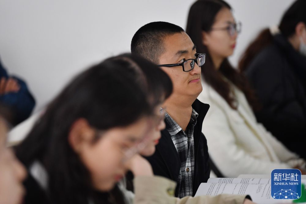 谢炎廷(右二)和同学在兰州大学上课(5月10日摄)。
