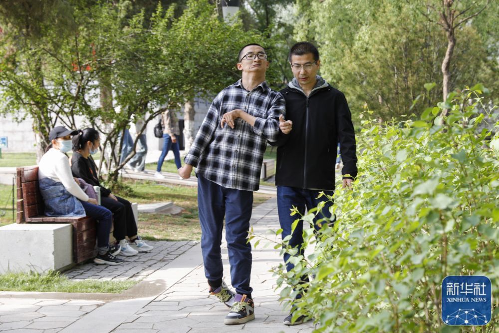 在兰州大学,母亲刘小凤扶着谢炎廷(右)散步(5月12日摄)。