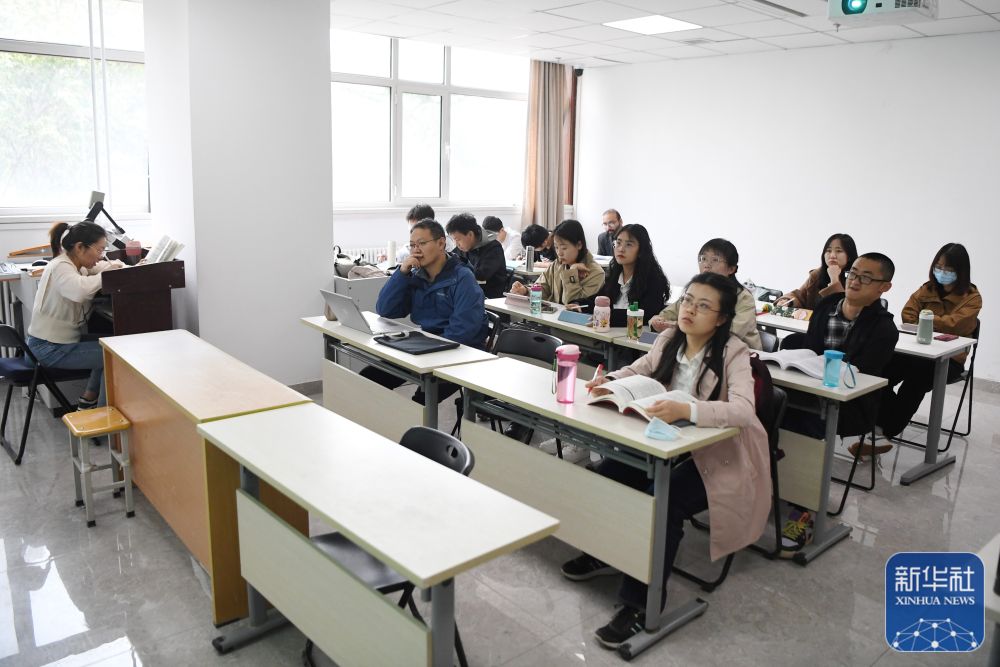 谢炎廷和同学在兰州大学的教室里上课(5月10日摄)。