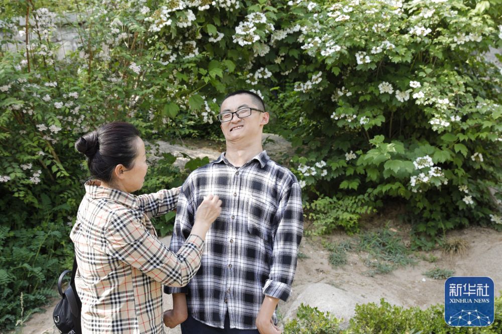 在兰州大学,母亲刘小凤帮谢炎廷整理衣服(5月12日摄)。