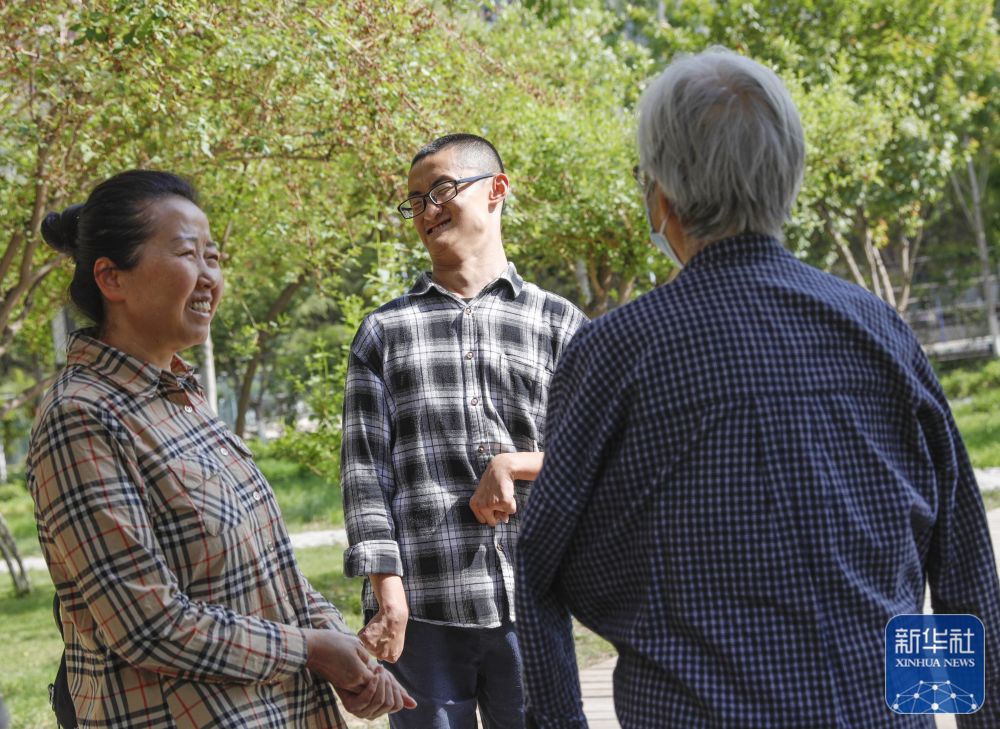 在兰州大学,谢炎廷和母亲刘小凤(左)与一位关心谢炎廷近况的奶奶交谈(5月12日摄)。