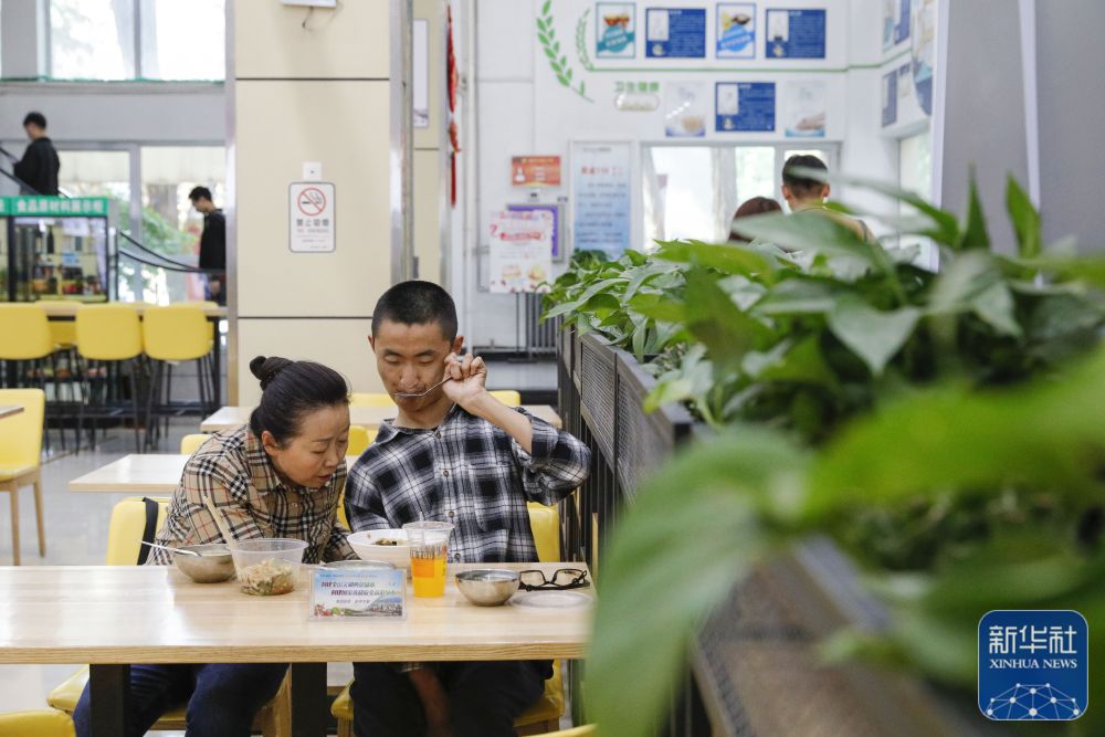 谢炎廷和母亲刘小凤在兰州大学的食堂吃饭(5月12日摄)。从力排众议支持谢炎廷来兰州大学旁听,到筹款在兰州大学本部校区旁买房、为孩子创造只过一条马路的上学距离,再到日常生活中吃饭、穿衣、洗澡等无微不至的关怀,刘小凤几乎将所有的心血都倾注在儿子身上。