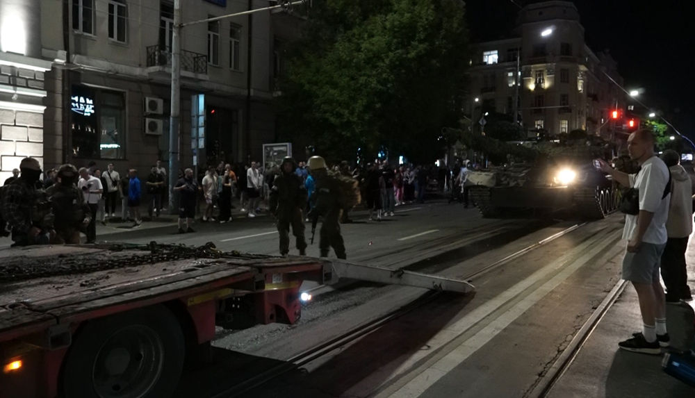 ↑6月24日,在俄罗斯顿河畔罗斯托夫,坦克准备撤离(视频截图)。新华社发(弗拉基米尔摄)