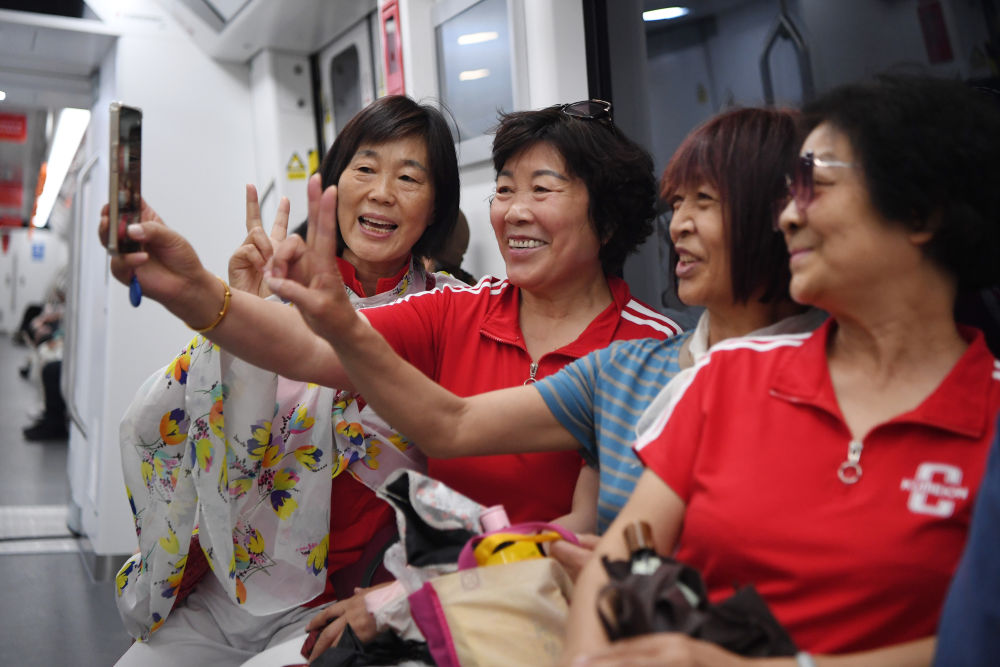 6月29日,乘客在兰州轨道交通2号线列车上拍照留念。新华社记者陈斌摄