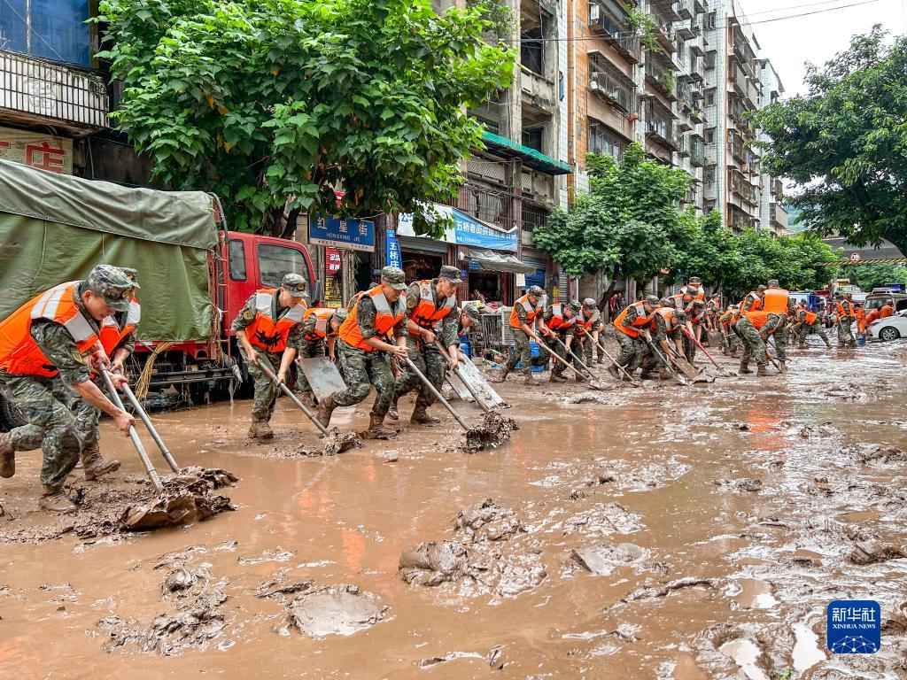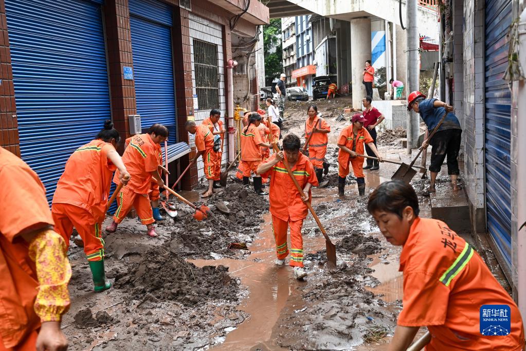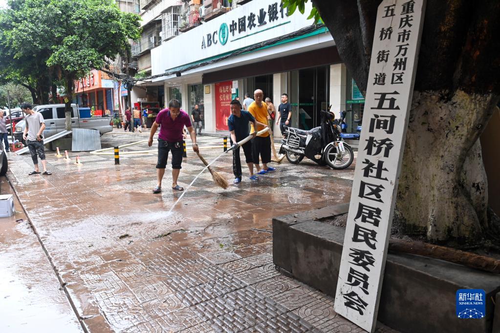 7月4日,重庆万州区五桥街道,当地干部和群众在积水退去后对街道进行清理。