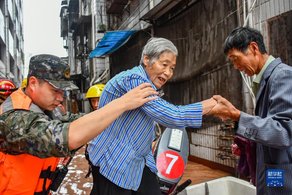 7月4日,在重庆市万州区五桥街道,武警重庆总队船艇支队官兵在转移受困群众。