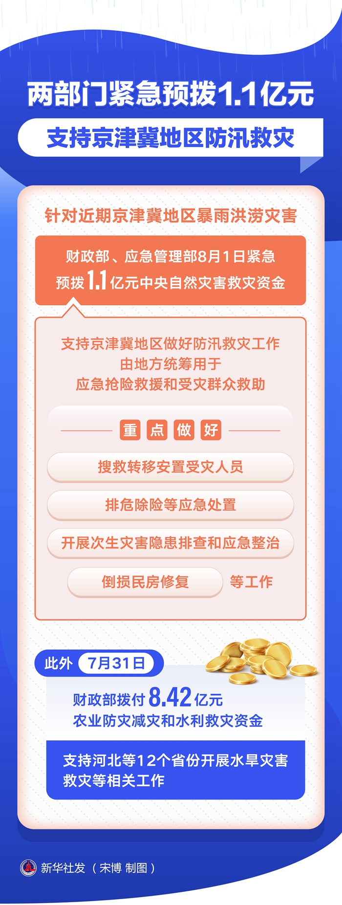 此外,7月31日,财政部拨付8.42亿元农业防灾减灾和水利救灾资金,支持河北等12个省份开展水旱灾害救灾等相关工作。财政部要求各省级财政部门及时下拨中央财政补助资金,切实加强资金监管,充分发挥资金效益,把保障人民群众生命财产安全放在第一位,最大限度减少人员伤亡和财产损失。