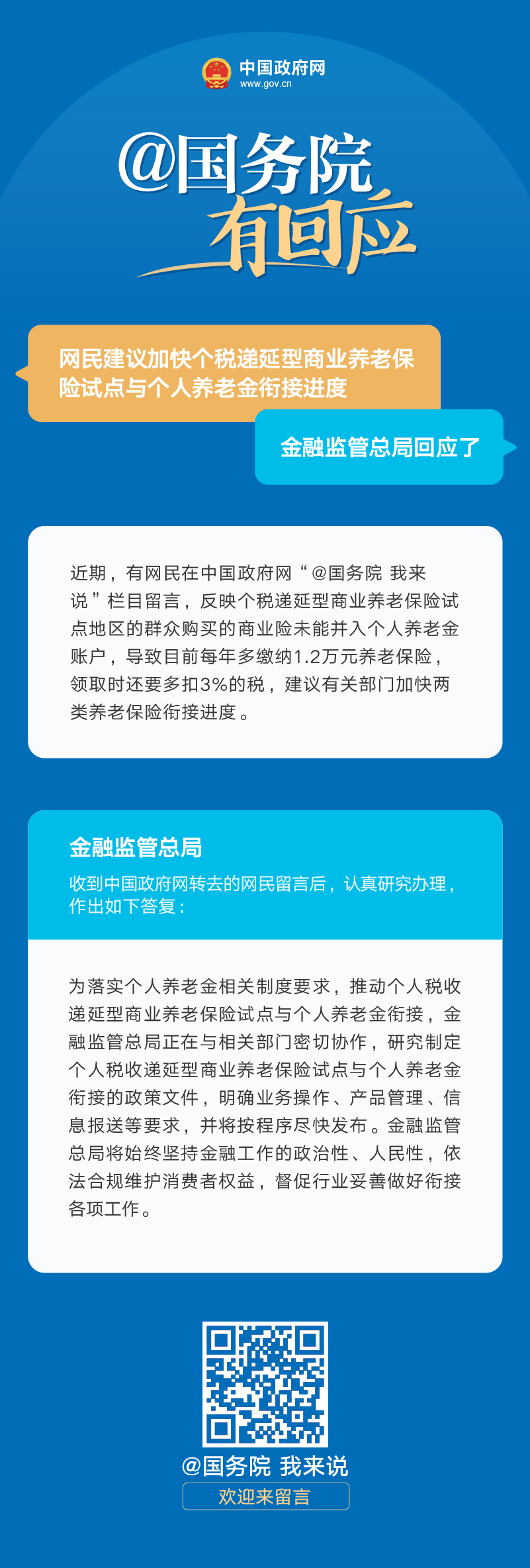 近期,有网民在中国政府网“@国务院 我来说”栏目留言,反映个税递延型商业养老保险试点地区的群众购买的商业险未能并入个人养老金账户,导致目前每年多缴纳1.2万元养老保险,领取时还要多扣3%的税,建议有关部门加快两类养老保险衔接进度。