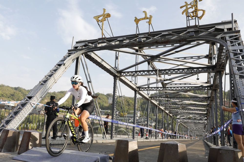 8月5日,骑行爱好者骑行通过中山桥。新华社记者方欣摄
