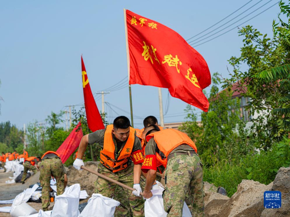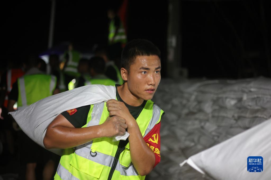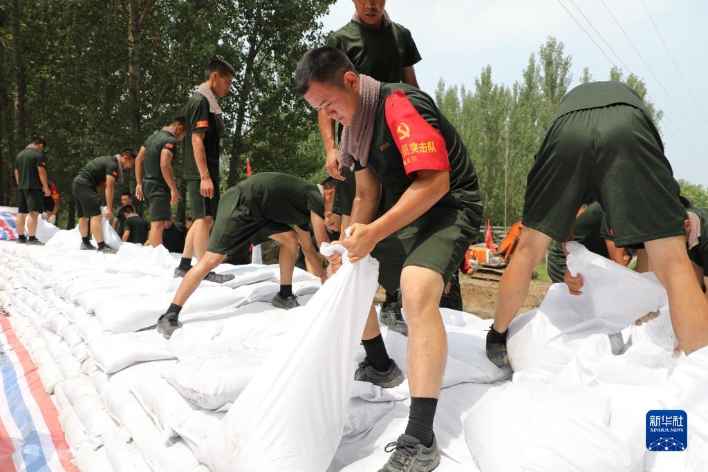 中部战区陆军第82集团军“铁军旅”官兵在大清河天津静海段加固堤坝(8月8日摄)。新华社发(杨仕伟 摄)