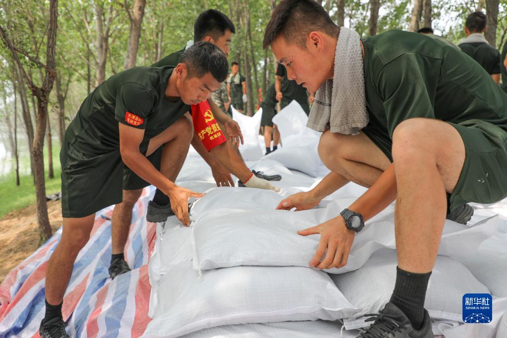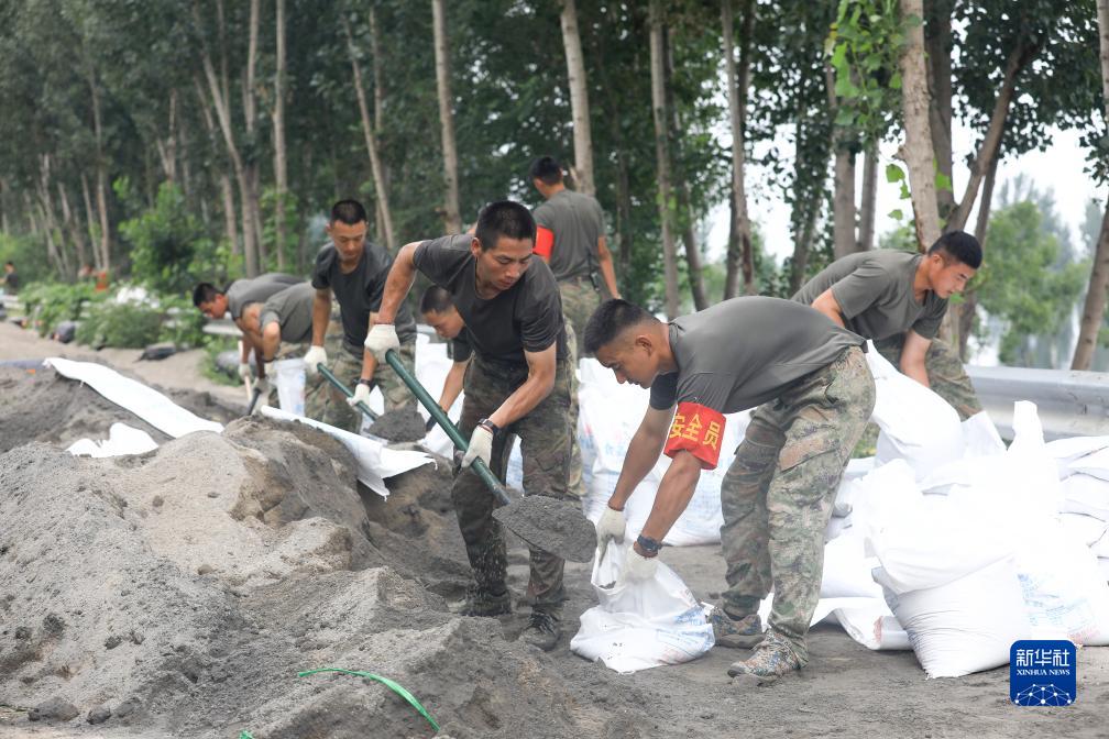 中部战区陆军第81集团军某防空旅官兵在大清河天津静海段装填沙袋加固大堤(8月8日摄)。新华社发(陈龙 摄)