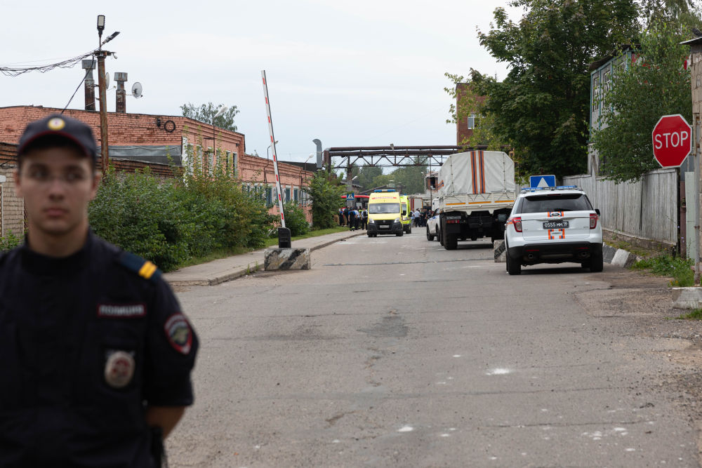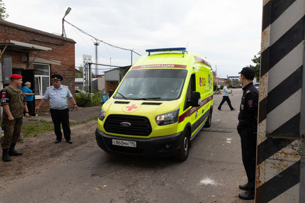 ↑8月9日,在俄罗斯莫斯科州,救护车驶出事发工厂。