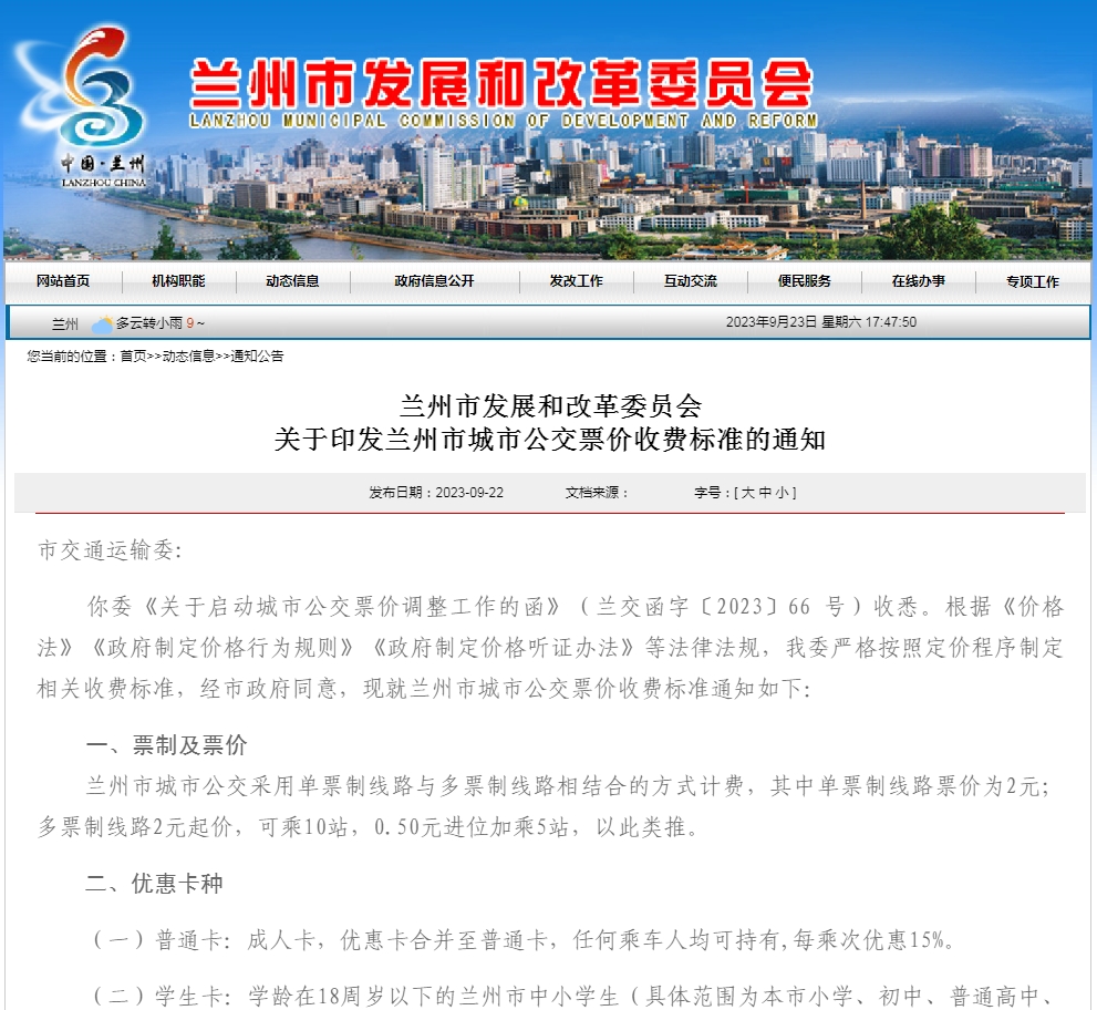 根据相关法律法规,严格按照定价程序制定相关收费标准,经市政府同意,9月22日,兰州市发展和改革委员会发布《关于印发兰州市城市公交票价收费标准的通知》(以下简称《通知》),兰州市城市公交采用单票制线路与多票制线路相结合的方式计费,其中单票制线路票价为2元;多票制线路2元起价,可乘10站,0.50元进位加乘5站,以此类推。《通知》自2023年9月23日起执行。