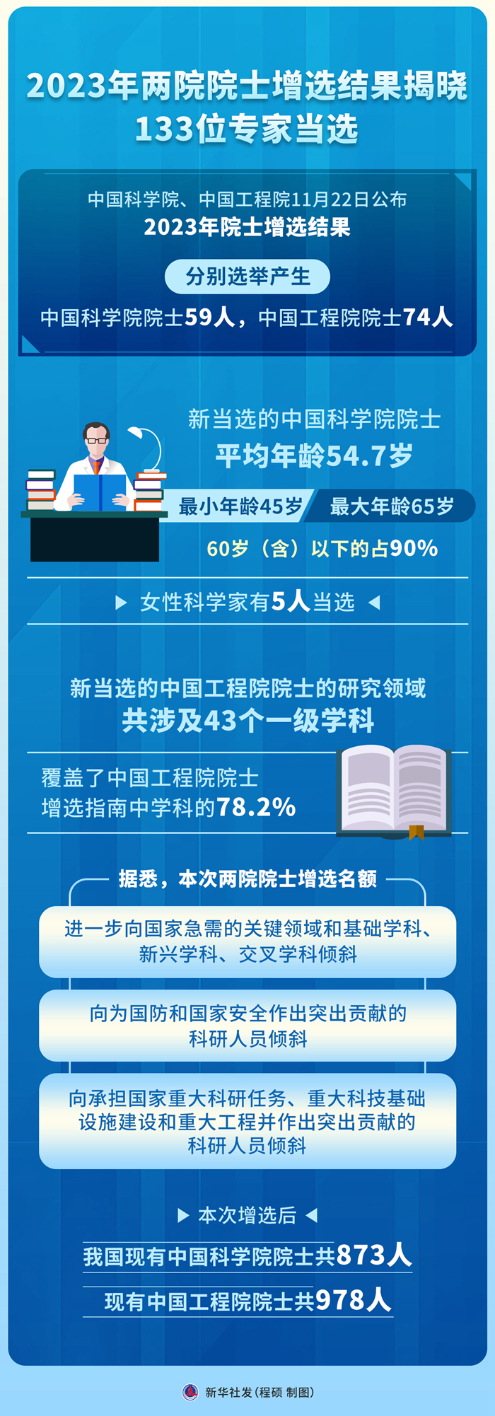 本次增选后,我国现有中国科学院院士共873人,现有中国工程院院士共978人。