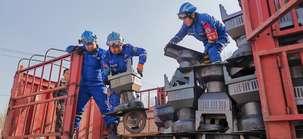 12月20日,救援人员向各安置点分发物资。新华社记者 多蕾 摄