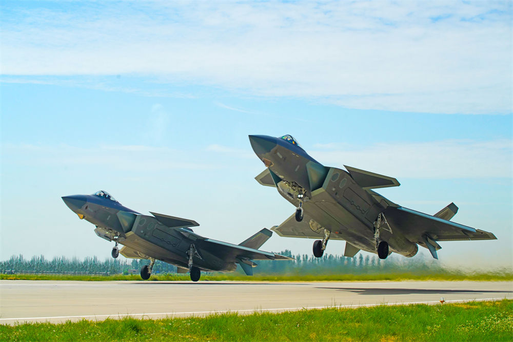 空军航空兵某旅飞行一大队飞行员驾驶歼-20战机编队起飞(2022年7月17日摄)。新华社发(王鸿飞 摄)