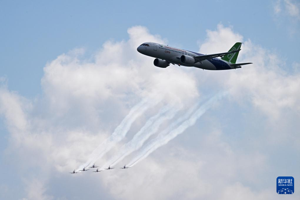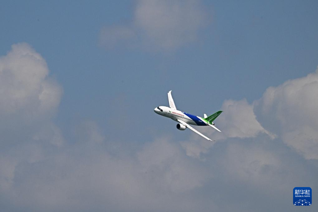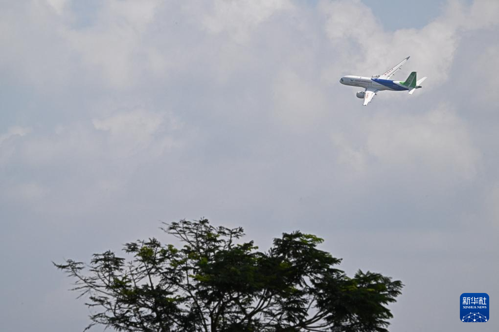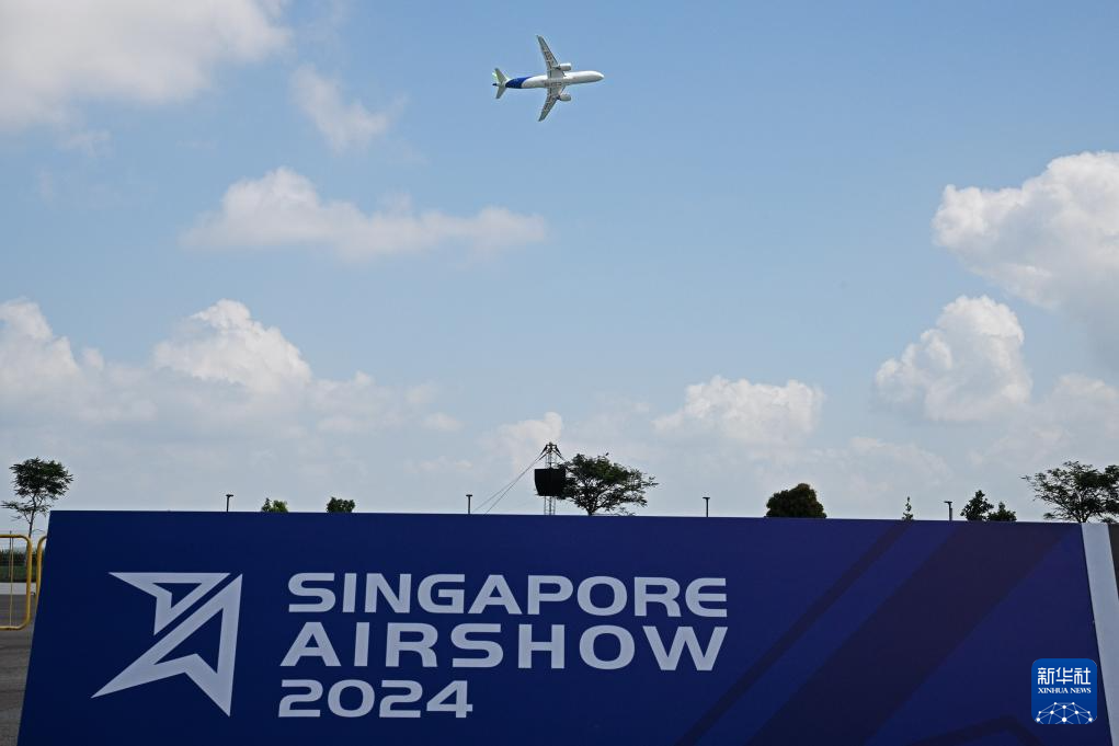 2月18日,中国国产大型客机C919在新加坡航展开幕前进行预演飞行。