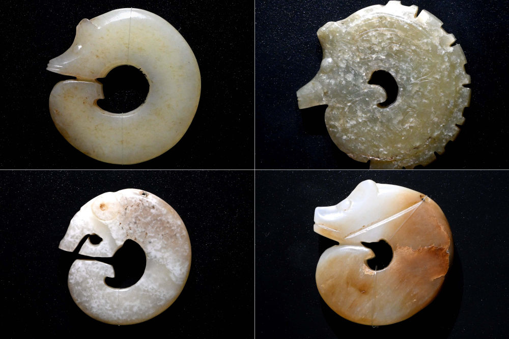 这是河南安阳殷墟博物馆新馆内展出的龙形玉玦(拼版照片,2024年1月9日摄)。新华社记者李安摄