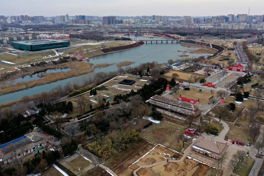 这是隔河相望的河南安阳殷墟宫殿宗庙遗址(右)与殷墟博物馆新馆(无人机照片,2024年2月23日摄)。新华社记者李安摄