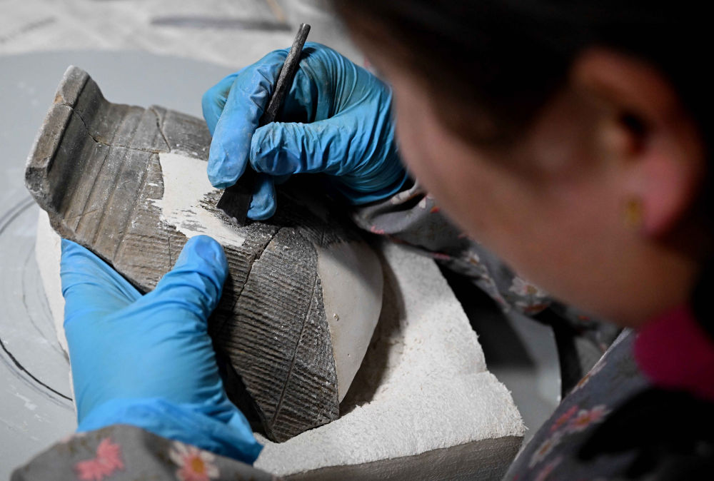 在中国社会科学院考古研究所安阳工作站,工作人员在对殷墟洹北商城出土的陶片进行整理修复(2024年2月23日摄)。新华社记者李安摄