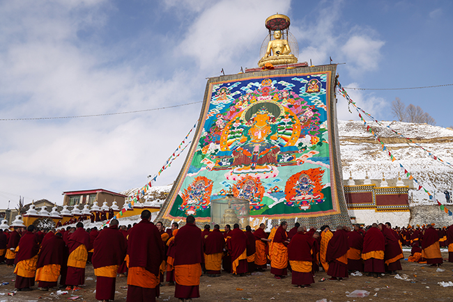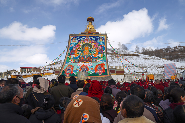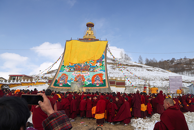 “莫郎节”是藏区规模最大最隆重的宗教节日庆典,“晒佛节”被称之为莫郎节中节。莫郎节期间举行各种大型的诵经、跳神、降神、驱鬼等宗教活动。