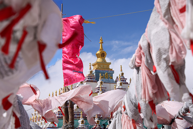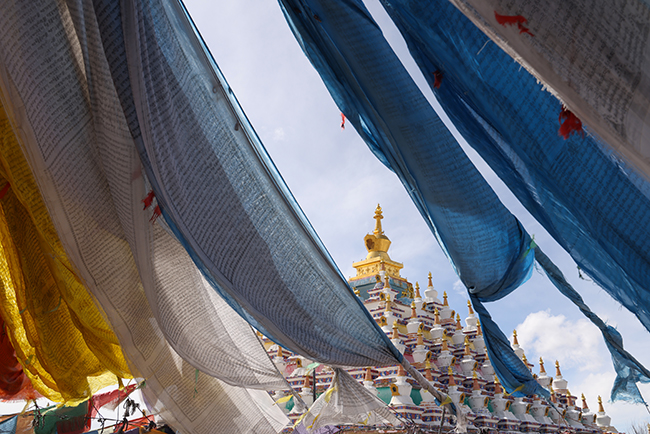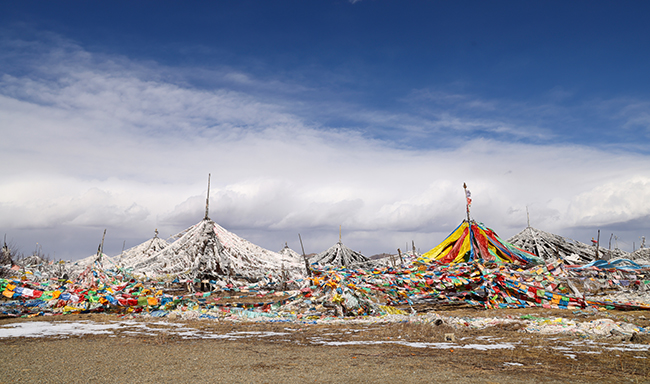 在塔林周围信徒还虔诚地挂起连绵的经幡。经幡是我们在藏区经常能够见到的一种景观,经幡就是在布、麻织品上书写经文,然后将其挂在山巅、路口、河边等任何地方。信奉藏传佛教的人们认为,经幡随风而舞,每飘动一下,就是在诵经一次,就是在向神传达人的愿望,祈求神的庇佑。