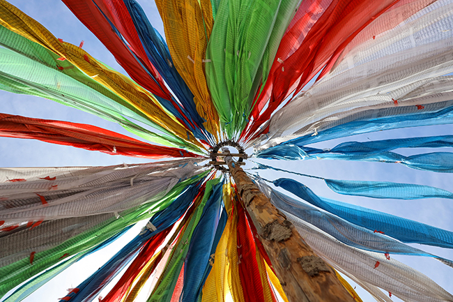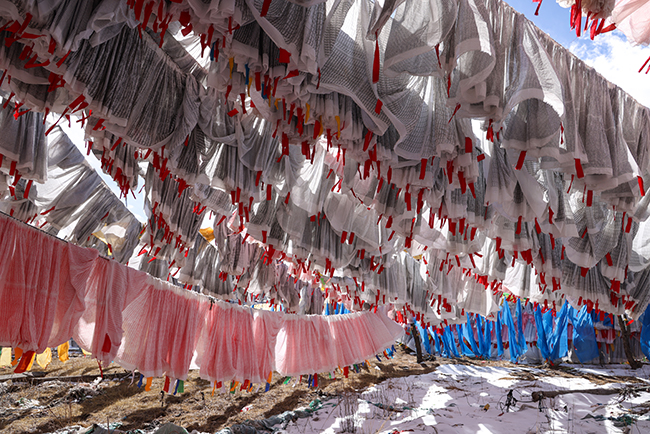 有经幡在就意味着神灵在,也意味着这里是人们对神灵的祈求所在。经幡寄托着人们美好的愿望,因此任何挂起来的经幡都不可以人为的拆除和清理,只能任其风吹日晒,慢慢地风化而去。