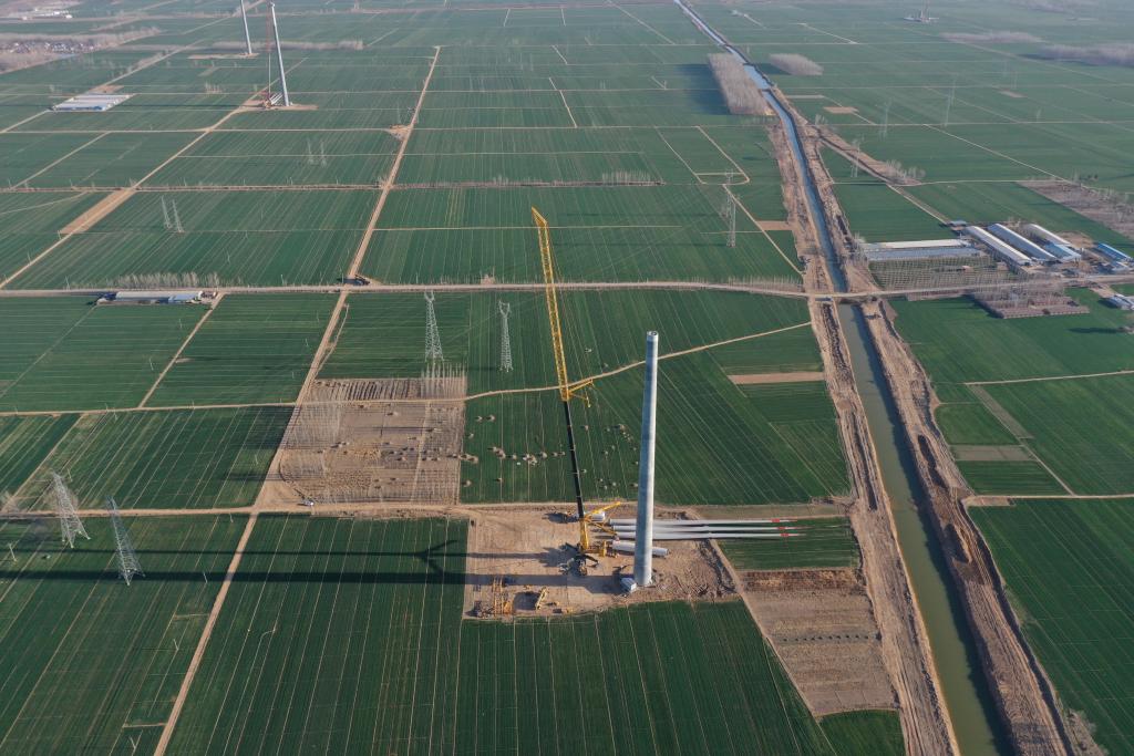 3月22日,在河北省衡水市景县北留智镇德坡村外的风电机组安装工地上,由中国自主研制的XCA4000轮式起重机在进行风电机组吊装作业(无人机照片)。新华社发