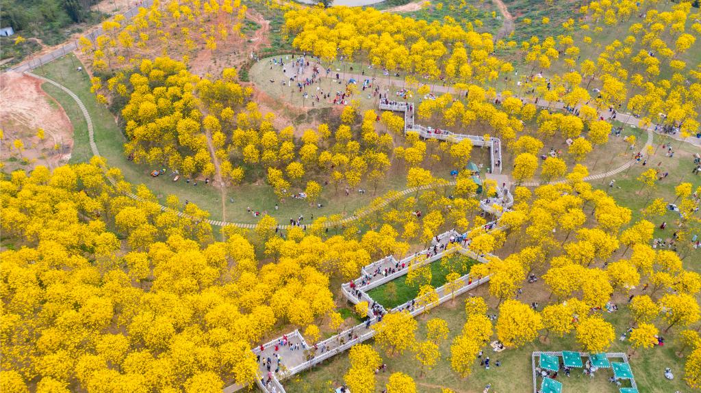 南宁市青秀山风景区里大片黄花风铃木迎来盛花期。(黄瑾琦 摄)