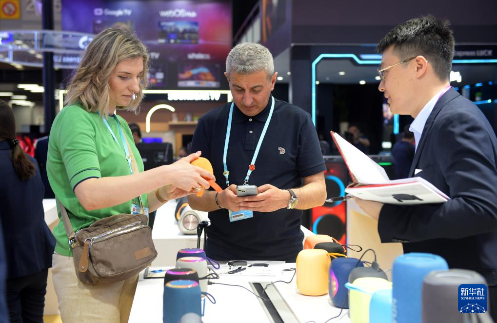 4月15日,客商在广交会展馆内选购音箱。新华社记者 卢汉欣 摄