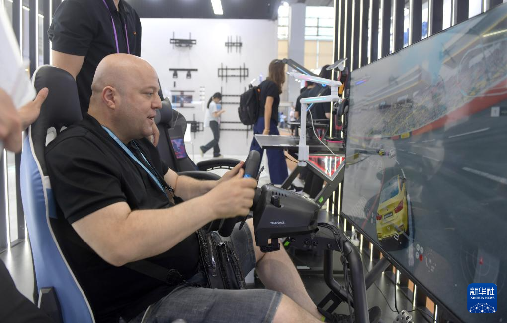 4月15日,客商在广交会展馆内体验赛车游戏。新华社记者 卢汉欣 摄
